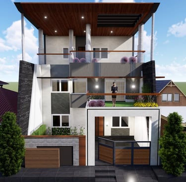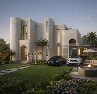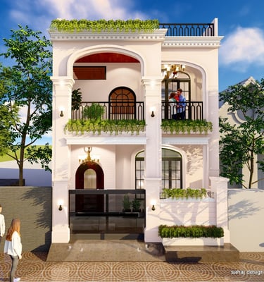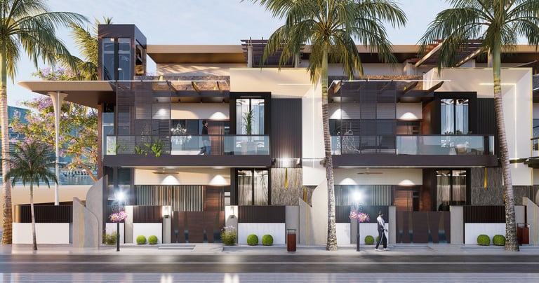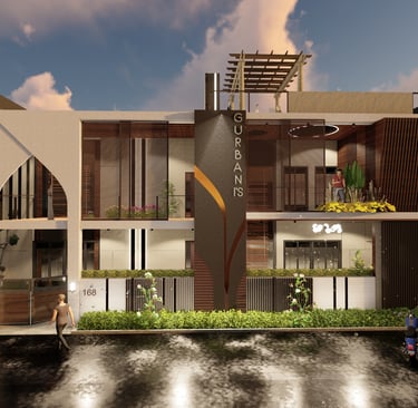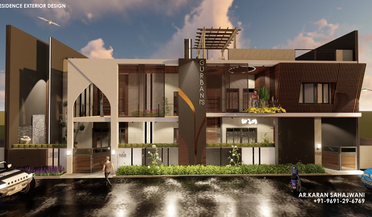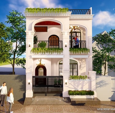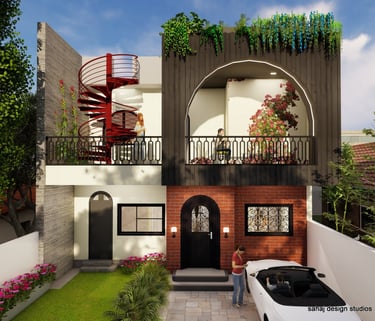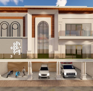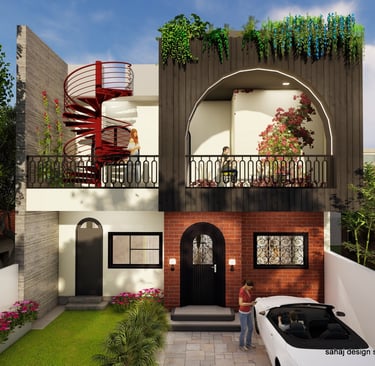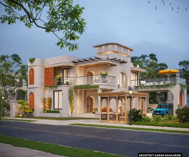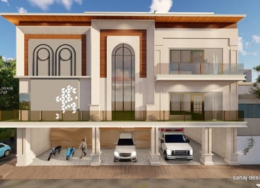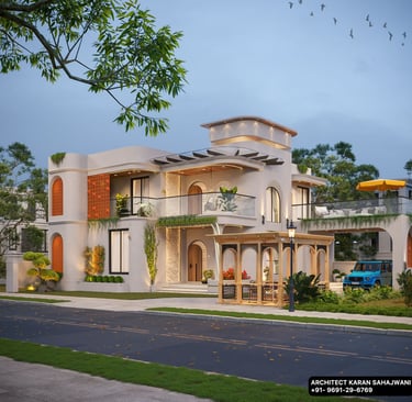 This beautifully designed G+1 bungalow blends modern elegance with soft architectural curves, creating a timeless and luxurious residential experience. The structure features distinctive curved corners that enhance the façade with a smooth, sculptural appeal while maintaining clean contemporary lines.